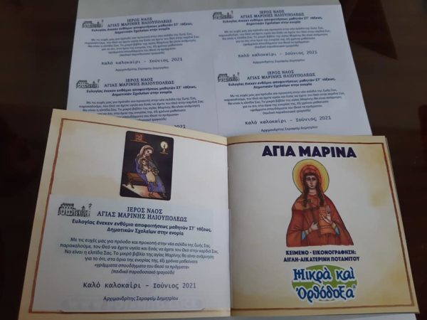 Σε μία συσκευασία, ένα μικρό παιδικό βιβλιαράκι με το βίο της Αγίας Μαρίνης και ένα γλύκισμα παραδόθηκαν, το πρωί της Τετάρτης 23 Ιουνίου 2021, από την υπεύθυνη Νεότητος και γραμματέα του εκκλησιαστικού Συμβουλίου Βασιλική Φαλίδα στους έξι διευθυντές των σχολείων, για να δοθούν από τους δασκάλους στους τελειόφοιτους μαθητές.