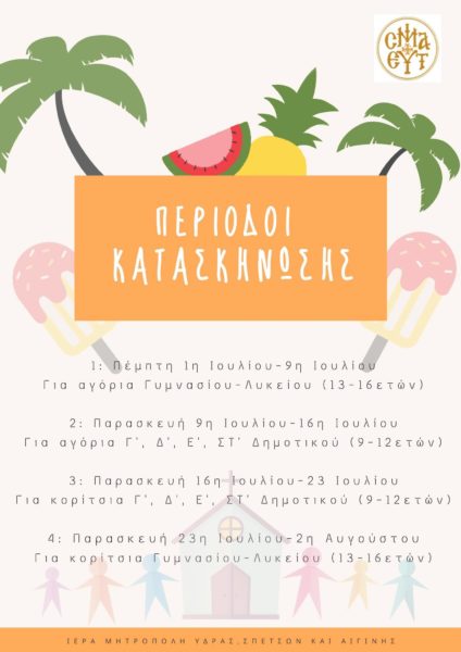 Ξεκίνησαν οι ηλεκτρονικές εγγραφές για την κατασκήνωση της Ιεράς Μητροπόλεως Ύδρας, Σπετσών και Αιγίνης για το 2021 στην Αίγινα.