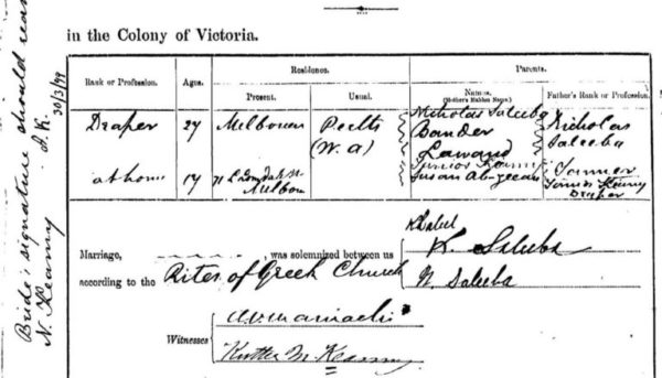 Στην περίπτωση αυτή ο πρώτος ελληνορθόδοξος γάμος ξεπέρασε τα σύνορα της τότε Αποικίας, με τον γαμπρό να κατοικεί στη Δυτική Αυστραλία και τη νύφη στη Βικτώρια. Πολύ πιθανόν να ήταν γάμος με συνοικέσιο, αντιπροσώπευε την ένωση δύο από τις πιο επιφανείς οικογένειες Σύρων εκείνης της εποχής.