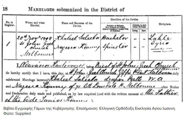 Αντίγραφο Πιστοποιητικού Γάμου του πρώτου ελληνορθόδοξου γάμου στην Αυστραλία. Φώτο: Supplied