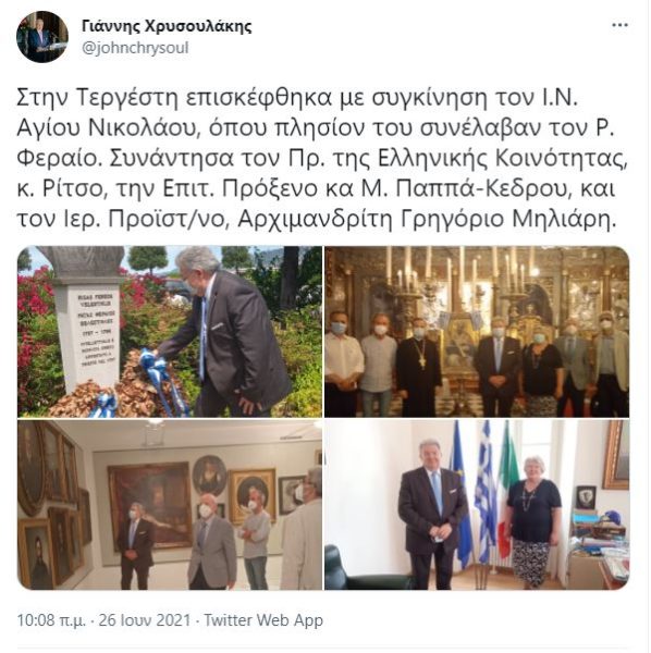 Μάλιστα ο κ. Χρυσουλάκης έκανε ανάρτηση στα Μέσα Κοινωνικής Δικτύωσης όπου έγραψε: “Στην Τεργέστη επισκέφθηκα με συγκίνηση τον Ι.Ν. Αγίου Νικολάου, όπου πλησίον του συνέλαβαν τον Ρ. Φεραίο. Συνάντησα τον Πρ. της Ελληνικής Κοινότητας, κ. Ρίτσο, την Επιτ. Πρόξενο κα Μ. Παππά-Κεδρου, και τον Ιερ. Προϊστ/νο, Αρχιμανδρίτη Γρηγόριο Μηλιάρη”.