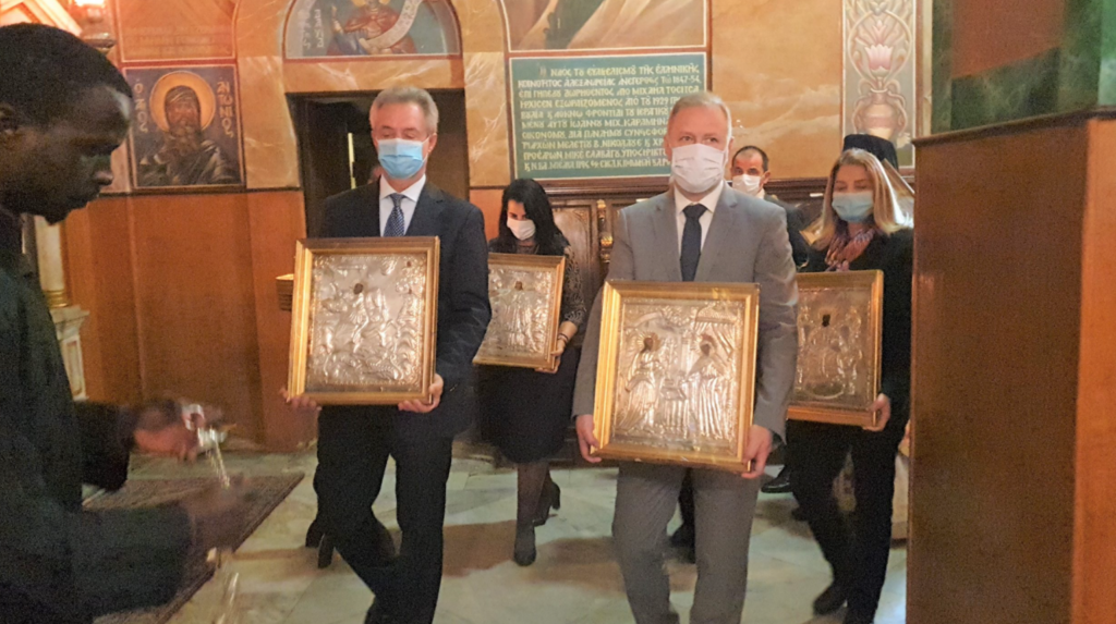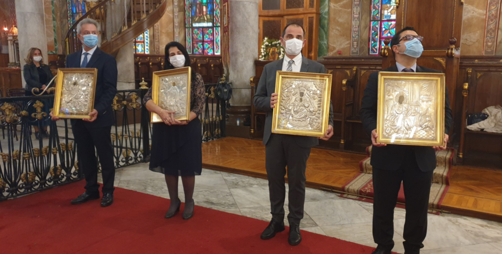 Συγκινητική και η ακολουθία της ανύψωσης των εικόνων, τις οποίες κράτησαν ευλαβικά ο Γενικός Πρόξενος της Ελλάδας στην Αλεξάνδρεια κ. Αθανάσιος Κοτσιώνης, ο Πρόεδρος της Ελληνικής Κοινότητας Αλεξανδρείας κ. Ιωάννης Σιόκας, ο Α΄ Αντιπρόεδρος της Ε.Κ.Α. κ. Αντρέας Βαφειάδης, ο Γενικός Γραμματέας της Ε.Κ.Α. κ. Δημήτρης Κάβουρας, η Πρόεδρος της Κυπριακής Αδελφότητας κα Μάρω Φορμόζη και η Πρόεδρος του ΕΝΟΑ και του Πτολεμαίου κα Λιλίκα Θλιβίτου, παρουσία της Προέδρου του Λυκείου Ελληνίδων Αλεξανδρείας κας Αλίκης Αντωνίου και του πρώην Δ/ντή του Ελληνικού Ιδρύματος Πολιτισμού παραρτήματος Αλεξανδρείας κ. Βασίλειου Φιλιππάτου.