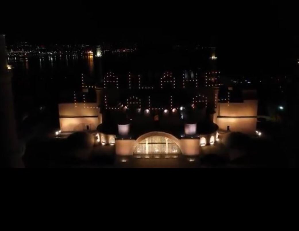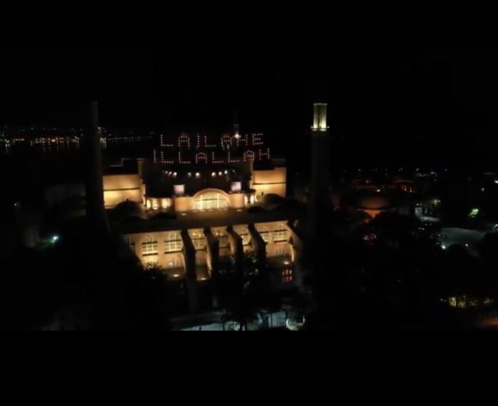 Συγκεκριμένα, το Σάββατο 8 Μαΐου 2021, με πρόφαση θρησκευτικούς εορτασμούς, οι τουρκικές αρχές τοποθέτησαν για πρώτη φορά φωτεινή επιγραφή με την φράση «Δεν υπάρχει άλλος θεός, εκτός από τον Αλλάχ» ανάμεσα στους δύο μιναρέδες που χτίστηκαν επί Οθωμανικής Αυτοκρατορίας, συνεχίζοντας την κορύφωση των προκλήσεων μετά την μετατροπή του Μνημείου Παγκόσμιας Κληρονομιάς σε τζαμί το περασμένο καλοκαίρι.