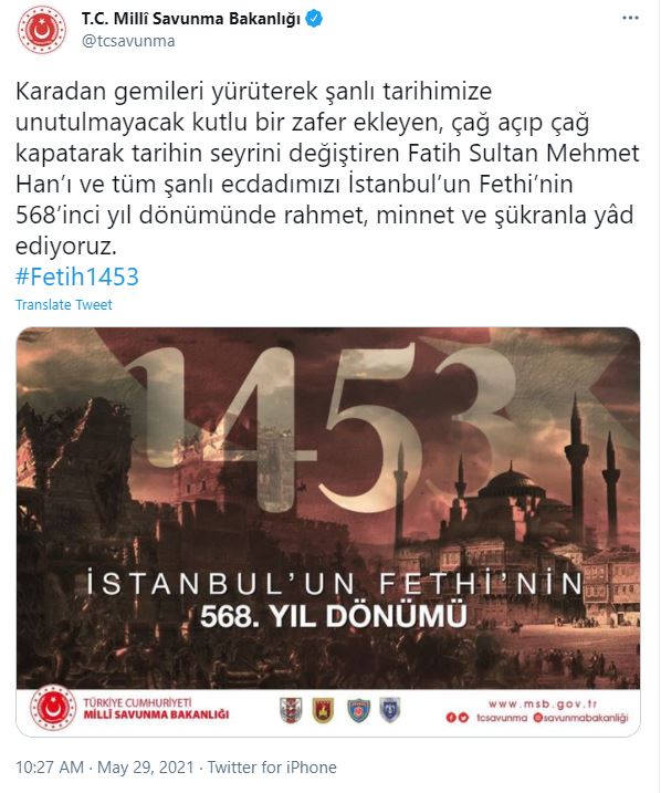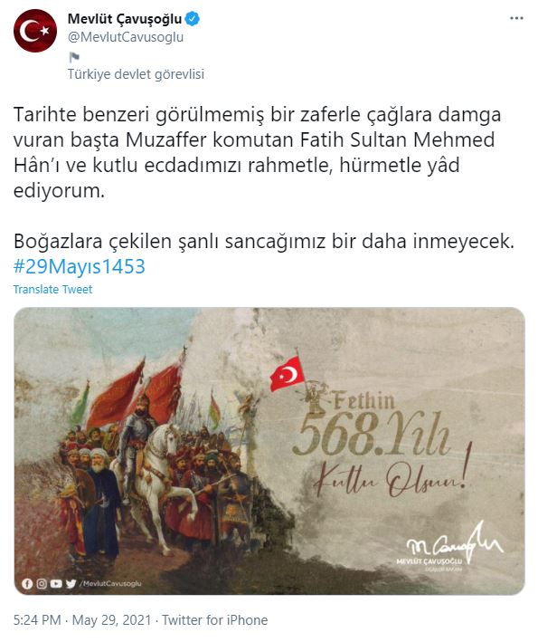 Νωρίτερα, σε ανάρτησή του στο Twitter, ανέφερε: “Τιμούμε τον Μωάμεθ τον Πορθητή και τον ένδοξο στρατό του, που πρόσθεσε αυτή την μοναδική πόλη στην πολιτιστική μας κληρονομιά, με έλεος και σεβασμό”.