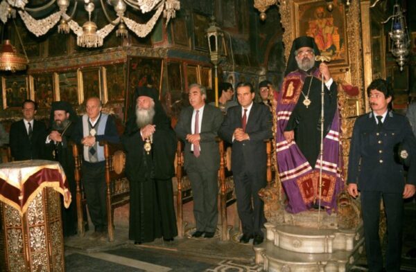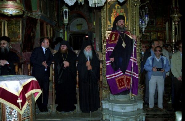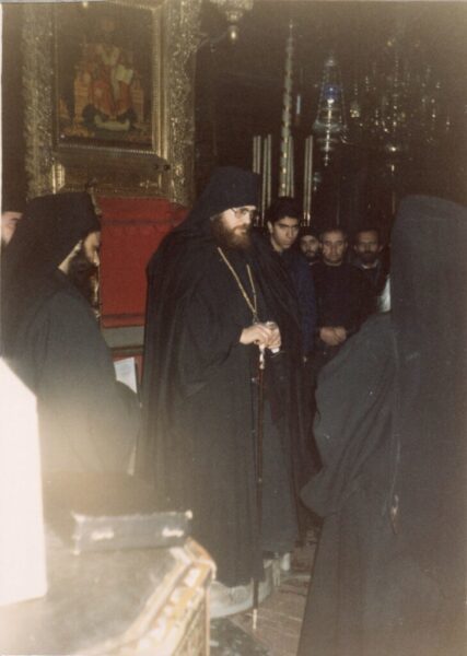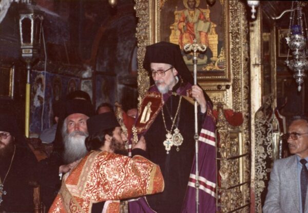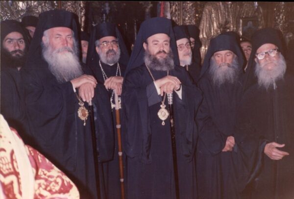 Κατά την τελετή ενθρονίσεως. Από Αριστερά οι τότε Μητροπολίτες Βεροίας κ. Παύλος (+), Κιτίου κ. Χρυσόστομος, Δημητριάδος κ. Χριστόδουλος (+) και ο Καθηγούμενος της Ι. Μ. Φιλοθέου Γέρων Εφραίμ (+).