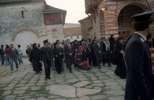 Υποδοχή του τότε Μητροπολίτη Δημητριάδος κ. Χριστοδούλου, μετέπειτα Αρχιεπισκόπου Αθηνών και πάσης Ελλάδος (+). Διακρίνονται ο Καθηγούμενος της Ι. Μ. Σταυροβουνίου Αρχιμ. Αθανάσιος, ο Καθηγούμενος Γέρων Εφραίμ Βατοπαιδινός και ο τότε Διοικητής του Αγίου Όρους κ. Κωνσταντίνος Λούλης.