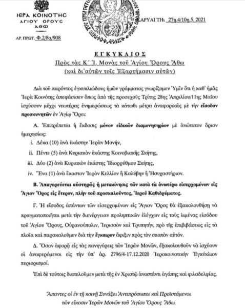Τέλος, όσο αφορά στις πανηγύρεις των Ιερών Μονών, εξακολουθούν να ισχύουν οι περιορισμοί που αναφέρονται στην υπ’ αρ. 2796/4-17.12.2020 Ιεροκοινοτική Εγκύκλιο.