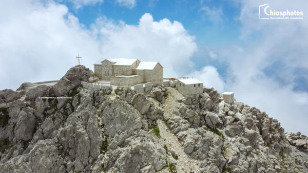 Στην κορυφή είναι χτισμένος ο Ιερός Ναός της Μεταμορφώσεως του Σωτήρος Χριστού. Ο ναός κτίστηκε επί οικουμενικού Πατριάρχου Ιωακείμ Γ’ το 1894 και εγκαινιάστηκε τον Αύγουστο του 1895. Πρόκειται για ένα ξεχωριστό Ναό, ένα πραγματικό θαύμα στα 2033 μ, χτισμένο από πέτρα που δένει αρμονικά με το περιβάλλον. Ο Ναός πανηγυρίζει για το Άγιον Όρος στις 19 Αυγούστου!