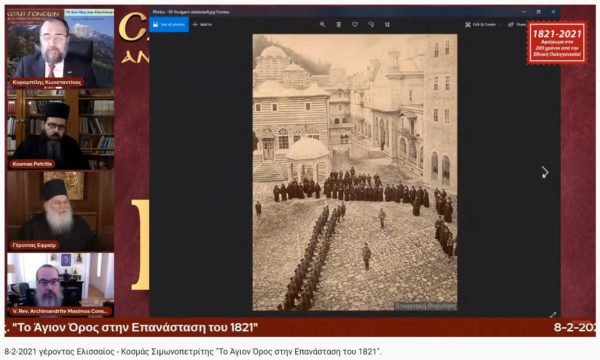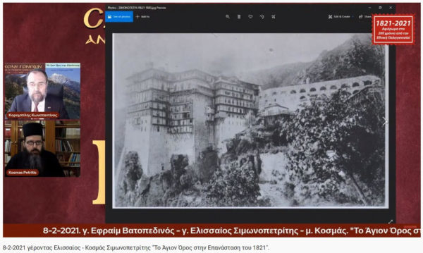 Ο καθηγούμενος της Ιεράς Μεγίστης Μονής Βατοπαιδίου γέροντας Εφραίμ και ο μοναχός Κοσμάς Σιμωνοπετρίτης, ο οποίος ανέγνωσε την εισήγηση του καθηγουμένου της Ι.Μ. Σίμωνος Πέτρας, γέροντα Ελισσαίου, ήταν οι ομιλητές στην χθεσινή (8/2/2021) διαδικτυακή εκδήλωση του Ανοικτού Πανεπιστημίου Κατερίνης με θέμα: «Το Άγιον Όρος στην Επανάσταση του 1821».