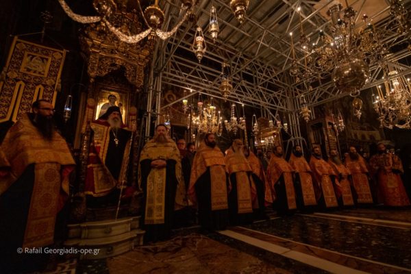 Μετά το πέρας της υποδοχής του Καθηγουμένου της Ι.Μ. Σταυρονικήτα, η Τίμια Ζώνη εξήλθε από το Ιερό Βήμα για την πανηγυρική αγρυπνία από τον Γέροντα Τύχωνα, παρουσία του Καθηγουμένου της Ιεράς Μεγίστης Μονής Βατοπαιδίου Γέροντα Εφραίμ, ιερέων, ιερομονάχων και διακόνων.