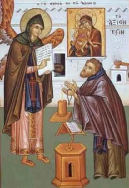 Ενώ ο Γέροντας του Κελιού απουσίαζε σε αγρυπνία του Πρωτάτου, συνέβη να φιλοξενήσει ο υποτακτικός του, που έμεινε μόνος στο κελί, κάποιον άγνωστο περαστικό μοναχό μαζί με τον οποίο, μάλιστα, έψαλλε και την ακολουθία του όρθρου της Κυριακής. Όταν λοιπόν έφθασαν στην θ ‘ ωδή του κανόνα, ο μεν μοναχός του Κελιού έψαλλε “Την Τιμιωτέραν”, το γνωστό αρχαίο αυτό ύμνο του Αγίου Κοσμά του Ποιητή, που ψαλλόταν τότε όπως και σήμερα μαζί με τους θεομητορικούς στίχους της θ ‘ ωδής (Μεγαλύνει η ψυχή μου τον Κύριον…”), ενώ ο ξένος μοναχός άρχισε τον ύμνο διαφορετικά, προσθέτοντας στην αρχή του το μέχρι τότε άγνωστο προοίμιο «Άξιον εστίν ως αληθώς…».