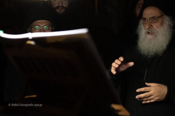 Στα ιερά αναλόγια ψάλλουν οι Βατοπαιδινοί Πατέρες.