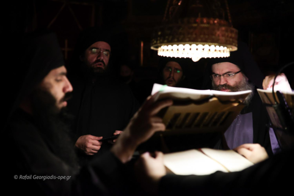Στα ιερά αναλόγια ψάλλουν οι Βατοπαιδινοί Πατέρες.