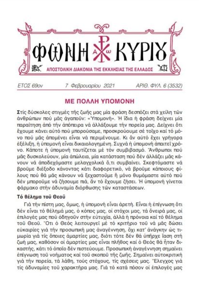 ΔΙΑΒΑΣΤΕ ΔΙΑΔΙΚΤΥΑΚΑ τη “Φωνή Κυρίου” της Αποστολικής Διακονίας της Εκκλησίας της Ελλάδος – ΚΥΡΙΑΚΗ ΙΣΤ’ ΜΑΤΘΑΙΟΥ – όπως αυτή διεμοιράσθη σε όλους τους ιερούς ναούς της ελληνικής επικράτειας, αλλά και του εξωτερικού, κατά την 7η Φεβρουαρίου 2021.