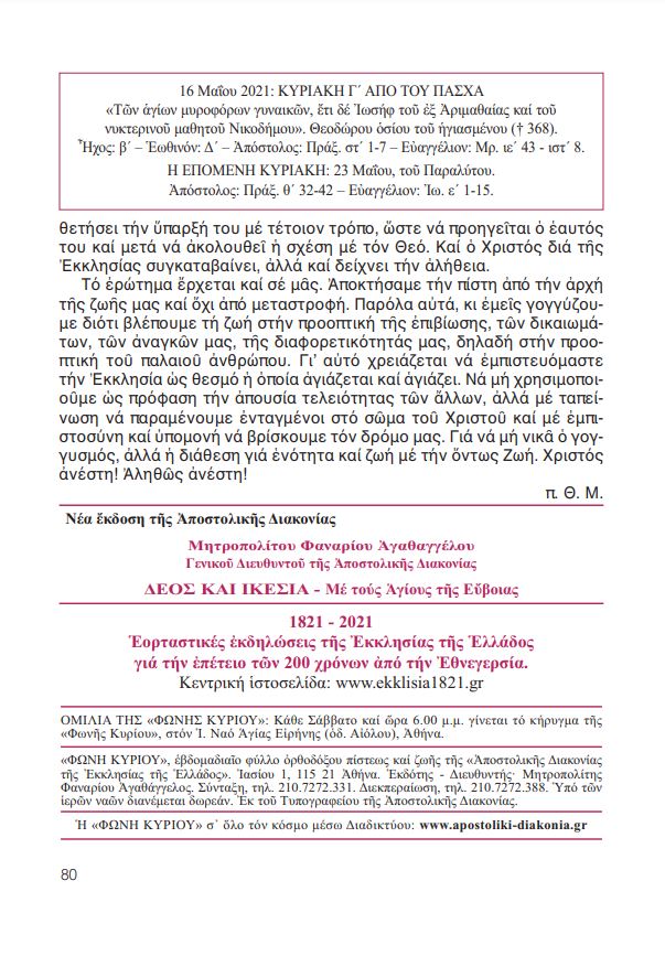 ΔΙΑΒΑΣΤΕ τη Φωνή Κυρίου της Αποστολικής Διακονίας της Εκκλησίας της Ελλάδος – ΚΥΡΙΑΚΗ ΤΩΝ ΜΥΡΟΦΟΡΩΝ – όπως αυτή διεμοιράσθη σε όλους τους ιερούς ναούς της ελληνικής επικράτειας, αλλά και του εξωτερικού, κατά την 16η Μαϊου 2021.