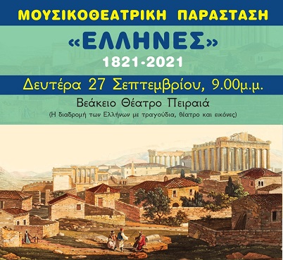 H μουσικοθεατρική παράσταση «ΟΙ ΕΛΛΗΝΕΣ» 1821 – 2021, θα πραγματοποιηθεί τη Δευτέρα 27 Σεπτεμβρίου, στις 9.00 μ.μ., στο Βεάκειο Θέατρο Πειραιά. Στην παράσταση παρουσιάζεται η διαδρομή των Ελλήνων με μουσική, θέατρο και εικόνες.