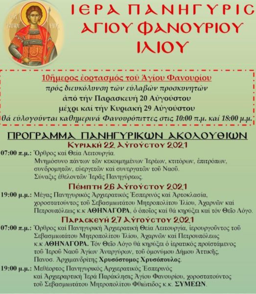 Η Ιερά Πανήγυρη του Αγίου Φανουρίου θα εορτασθεί το διήμερο της 26 και 27 Αυγούστου 2021, στο φερώνυμο παρεκκλήσιο του Εκκλησιαστικού Ορφανοτροφείου Βουλιαγμένης.
