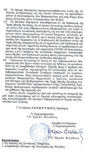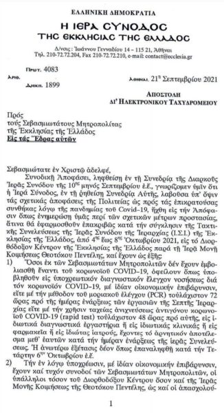 Στην Εγκύκλιο αναφέρεται ότι η Εκκλησία της Ελλάδος προχώρησε στη σχετική λήψη απόφασης κατά τη διάρκεια της συνεδρίασης της Διαρκούς Ιεράς Συνόδου στις 10 Σεπτεμβρίου προκειμένου να τηρηθούν όλα τα μέτρα τα οποία προβλέπονται από την Πολιτεία στο πλαίσιο της αποφυγής διασποράς του κορωνοϊου.