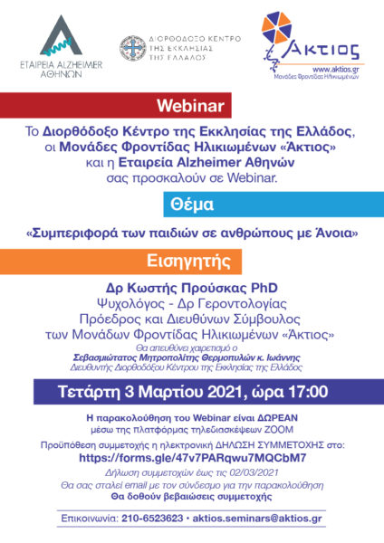 To Διορθόδοξο Κέντρο της Εκκλησίας της Ελλάδος, οι Μονάδες Φροντίδας Ηλικιωμένων «Άκτιος» και η Εταιρεία Alzheimer Αθηνών διοργανώνουν ένα Webinar με τίτλο “Συμπεριφορά των παιδιών, σε Ανθρώπους με Άνοια” όπου θα κάνει την εισήγησή του ο κ. Προύσκας ο οποίος είναι ψυχολόγος και πρόεδρος των Μονάδων Φροντίδας Ηλικιωμένων.