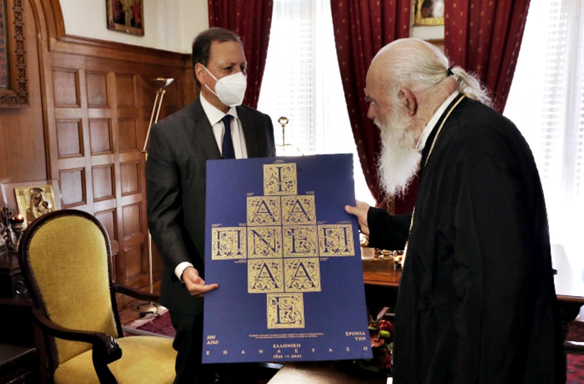 Ένα δώρο με ξεχωριστό συμβολισμό έκανε ο Υπουργός στον Αρχιεπίσκοπο: μια αριθμημένη, συλλεκτική μεταξοτυπία με τα αρχιγράμματα των μελών της Φιλικής Εταιρείας, σε έκδοση του μουσείου Μπενάκη.