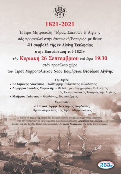 Η Ιερά Μητρόπολη Ύδρας, Σπετσών και Αιγίνης διοργανώνει στις 19:30 Επιστημονική Εσπερίδα στον Προαύλειο χώρο του Ιερού Μητροπολιτικού Ναού Κοιμήσεως της Θεοτόκου στην Αίγινα. Θέμα: «Η συμβολή της εν Αιγίνη Εκκλησίας στην Επανάσταση του 1821».
