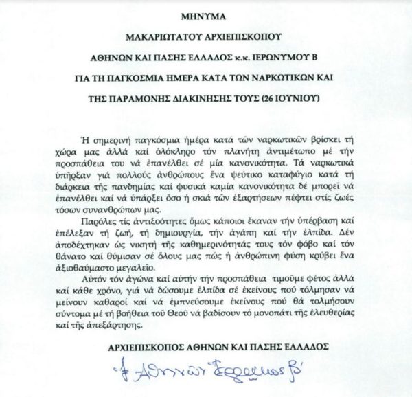 ΠΑΡΑΘΕΤΟΥΜΕ ΤΟ ΜΗΝΥΜΑ ΜΑΚΑΡΙΩΤΑΤΟΥ ΑΡΧΙΕΠΙΣΚΟΠΟΥ ΑΘΗΝΩΝ ΚΑΙ ΠΑΣΗΣ ΕΛΛΑΔΟΣ κ.κ. ΙΕΡΩΝΥΜΟΥ ΓΙΑ ΤΗ ΠΑΓΚΟΣΜΙΑ ΗΜΕΡΑ ΚΑΤΑ ΤΩΝ ΝΑΡΚΩΤΙΚΩΝ ΚΑΙ ΤΗΣ ΠΑΡΑΜΟΝΗΣ ΔΙΑΚΙΝΗΣΗΣ ΤΟΥΣ (26 ΙΟΥΝΙΟΥ). “Τα ναρκωτικά υπήρξαν για πολλούς ανθρώπους ένα ψεύτικο καταφύγιο κατά τη διάρκεια της πανδημίας και φυσικά καμία κανονικότητα δε μπορεί να επανέλθει και να υπάρξει όσο η σκιά των εξαρτήσεων πέφτει στις ζωές τόσων συνανθρώπων μας” αναφέρει, μεταξύ άλλων, ο Μακαριώτατος.