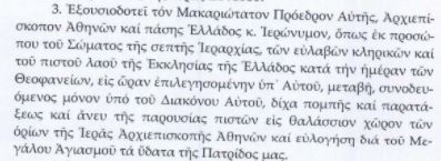 Στην εγκύκλιο εξουσιοδοτείται ο Αρχιεπίσκοπος Αθηνών και Πάσης Ελλάδος κ.κ. ιερώνυμος την ημέρα των Θεοφανείων και σε ώρα που θα επιλέξει, να μεταβεί συνοδευόμενος μόνο από τον Διάκονό του, χωρίς πομπή και άνευ παρουσίας πιστών σε θαλάσσιο χώρο εντός των ορίων της Αρχιεπισκοπής Αθηνών προκειμένου να ευλογήσει δια τα Μεγάλου Αγιασμού τα ύδατα της πατρίδος μας.
