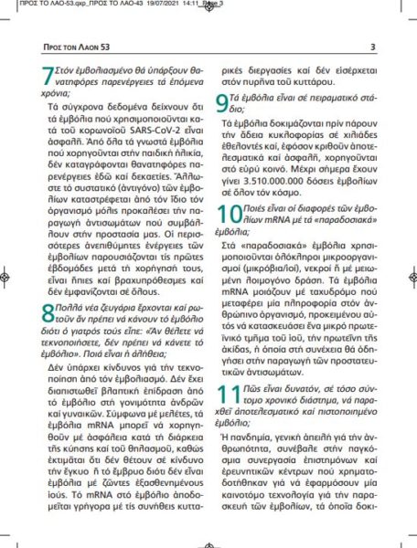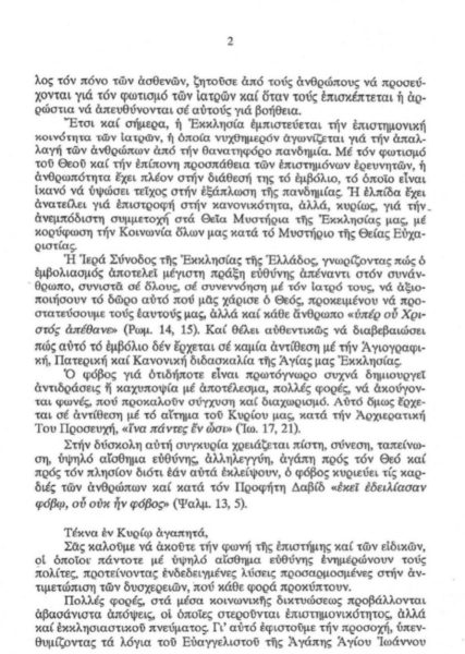 “Η Εκκλησία εμπιστεύεται την επιστημονική κοινότητα των ιατρών, η οποία νυχθημερόν αγωνίζεται για την απαλλαγή των ανθρώπων απο την θανατηφόρο πανδημία. Με τον φωτισμό του Θεού και την επίμονη προσπάθεια των επιστημόνων ιατρών, η ανθρωπότητα έχει πλέον στη διάθεση της το εμβόλιο, το οποίο είνα ικανό να υψώσει το τείχος στην εξάπλωση της πανδημίας” αναφέρεται, μεταξύ άλλων.