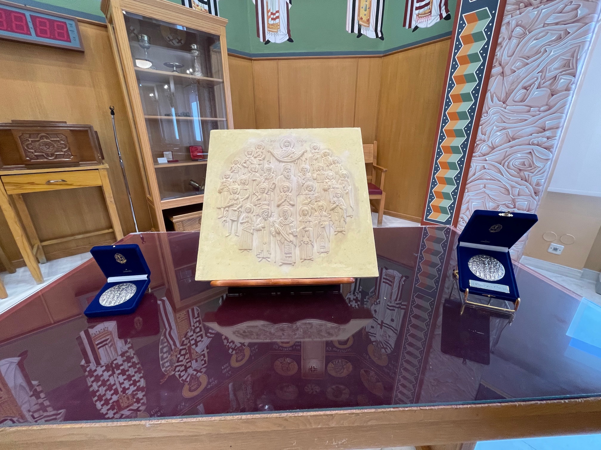 Στη συνέχεια παρουσίασε το μετάλλιο, αναλύοντας τα στάδια της κατασκευής του και αναφέροντας τις εικονιζόμενες μορφές. Συγκεκριμένα, στο έμβλημα αποτυπώνονται η Υπεραγία Θεοτόκος και οι Άγιοι Νεομάρτυρες Γρηγόριος ο Ε’, Κοσμάς ο Αιτωλός, Φιλοθέη η Αθηναία, Μιχαήλ Πακνανάς, Γεώργιος Νεαπολίτης, Κυπριανός Κύπρου, Κωνσταντίνος ο Υδραίος, Δημήτριος ο εκ Σαμαρίνης, Ακυλίνα, Αγγελής ο Αργείος, Αθανάσιος Κουλακιώτης, Τριαντάφυλλος ο εκ Ζαγοράς, Συμεών ο Τραπεζούντιος, Σεραφείμ Φαναρίου, Χρυσή εκ Μογλενών, Μαρία Καρατάσαινα, Ραφαήλ εξ Ιθάκης και εν Λέσβω, Κύριλλος ΣΤ’, Δημήτριος Πελοποννήσιος, Νικήτας Σερρών, Ιωάννης ο Μονεμβασιώτης, Ελένη εκ Σινώπης Πόντου, Κυράννα εκ της Όσσης, Ιωάννης εκ Καστορίας και Ιωάννης εκ Θάσου.