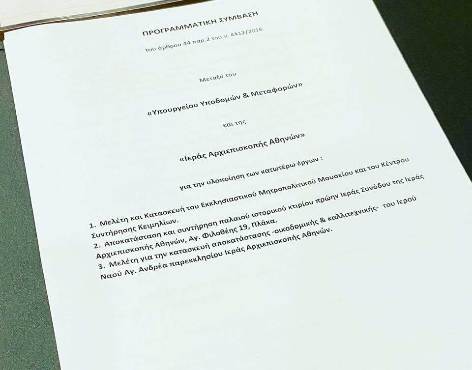 Τη σύμβαση υπέγραψαν την Πέμπτη 2 Ιουλίου ο Γενικός Γραμματέας Υποδομών κ. Γιώργιος Καραγιάννης και ο Αρχιεπίσκοπος Αθηνών και Πάσης Ελλάδος κ.κ. Ιερώνυμος.