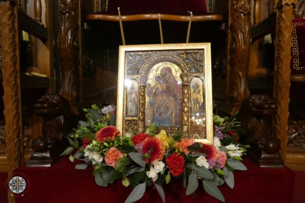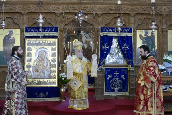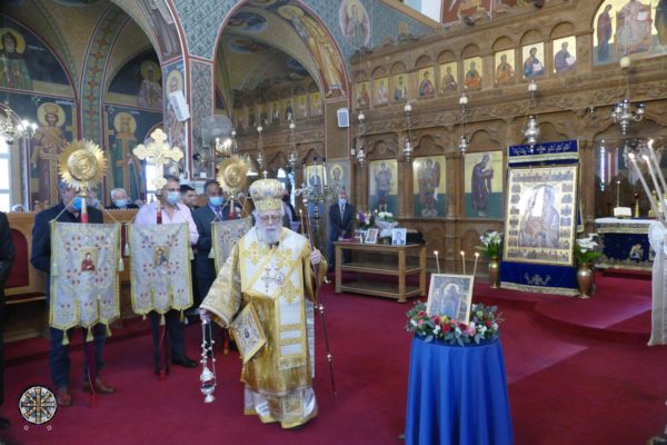 Της πανηγυρικής Θείας Λειτουργίας προέστη ο επιχώριος Μητροπολίτης Κωνσταντίας κ. Βασίλειος, πλαισιούμενος από τον προϊστάμενο του ναού Πρωτ. Ηρακλείδιο Ξιούρο και τους Διακόνους Επιφάνιο και Μάριο. Ως είθισται στην Κύπρω στο τέλος της Δοξολογίας, γίνεται τελετή ομοία με την Κυριακή της Σταυροπροσκυνήσεως όπου λιτανεύεται σε δίσκο ευτρεπισμένο με άνθη, ιερά εικόνα της Θεοτόκου φερούσης τον Χριστό.