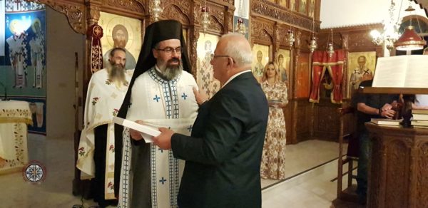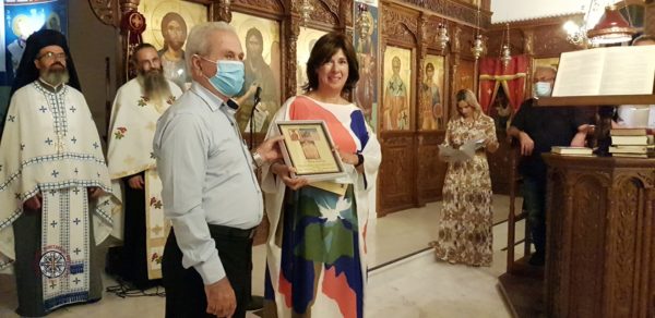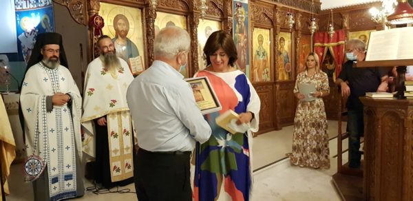 Ακολούθως επιδόθηκαν τιμητικές αναμνηστικές πλακέτες από τις Κοινότητες Πηγής και Περιστερώνας προς την πρώην Επίτιμη Πρόξενο της Κύπρου στην Ολλανδία κα Τασούλα Χατζητοφή, το Υπουργείο Μεταφορών και την Εκκλησία της Κύπρου για τις πολύχρονες προσπάθειες επαναπατρισμού των βημοθύρων του ιερού Ναού.