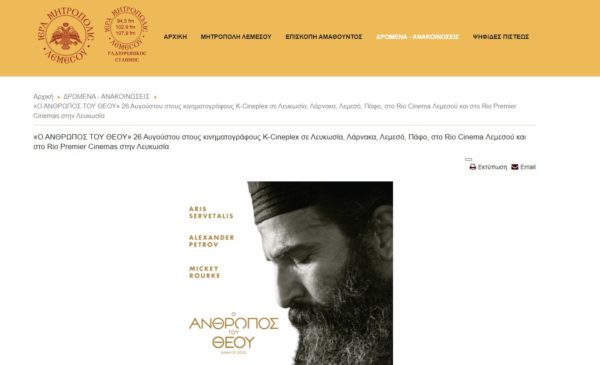 Η Ιερά Μητρόπολη Λεμεσού αναφέρεται με επίκαιρη ανάρτηση στον επίσημο ιστοτόπο της στην ταινία “Ο Άνθρωπος του Θεού” που πραγματεύεται τον Βίο του Αγίου Νεκταρίου και ξεκίνησε να προβάλλεται στις κινηματογραφικές αίθουσες της Ελλάδος και της Κύπρου.