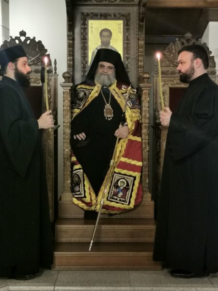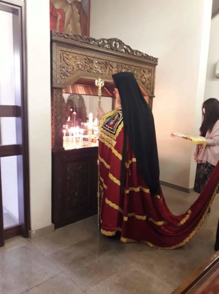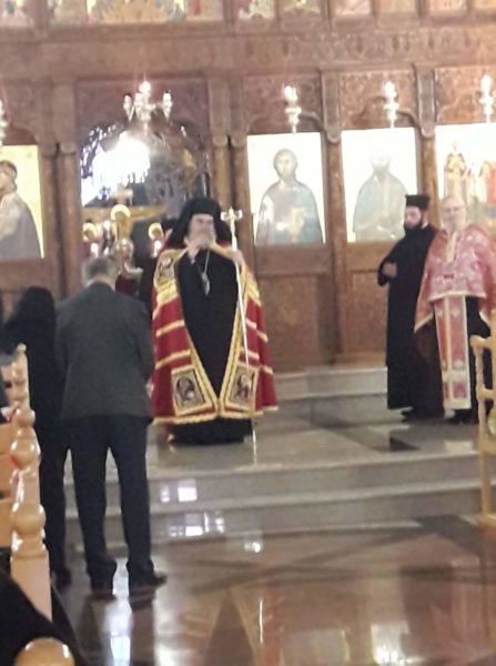 Τον Πανιερώτατο πλαισίωναν ο Προϊστάμενος του Ιερού Ναού, Πρωτοπρεσβύτερος Κυριάκος Κασπαρής, ο Πρωτοπρεσβύτερος Αδάμος Αδάμου, ο πατήρ Νικόλαος Παρασκευόπουλος, και ο Ιεροδιάκονος Ραφαήλ Μισιαούλης.
