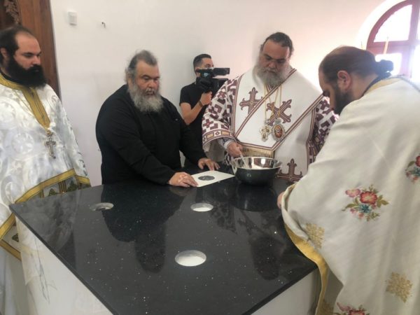 Ο Πανιερώτατος λιτάνευσε τα ιερά λείψανα τρεις φορές γύρω από το Παρεκκλήσιο, και στη συνέχεια ακολούθησε το τελετουργικό της εισόδου σε αυτόν, τον καθαγιασμό της Αγίας Τραπέζης με τα στάδια που έχει της τοποθέτησης των ιερών λειψάνων του Αγίου Μεγαλομάρτυρος Γεωργίου του Τροπαιοφόρου και των Μεγαλομαρτύρων γυναικών Μαρίνης και Ειρήνης στο “φυτό” της Αγίας Τραπέζης, της σφράγισής του με κηρομαστίχη, της έκπλυσης της Αγίας Τραπέζης με ζεστό νερό, σαπούνια και σφουγγάρια και το σκούπισμά της, το μύρωμα με Άγιο Μύρο, η ένδυσης με το κατασάρκιο επάνω στο οποίο ενεγράφη η ημερομηνία των εγκαινίων και υπογράφηκε από τον Πανιερώτατο, και με τα λευκά άμφια των εγκαινίων, το άναμμα της κανδήλας της Αγίας Τραπέζης και τον καθαγιασμό του Παρεκκλησίου.