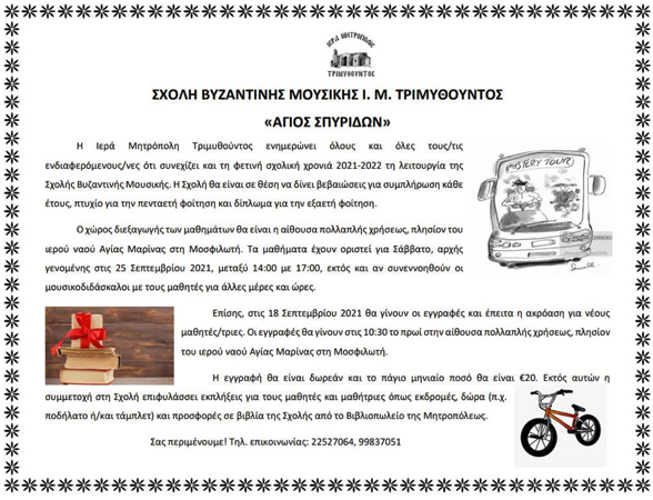 Τη νέα σχολική χρονιά 2021 -2022 θα λειτουργήσει με νέο ανανεωμένο πρόγραμμα σπουδών η Βυζαντινή Σχολή Μουσικής της Ιεράς Μητροπόλεως Τριμυθούντος, “Άγιος Σπυρίδωνας”. Η Σχολή είναι σε θέση να δίνει βεβαιώσεις για συμπλήρωση κάθε έτους, πτυχίο για την τετραετή φοίτηση και δίπλωμα για την εξαετή σπουδή.