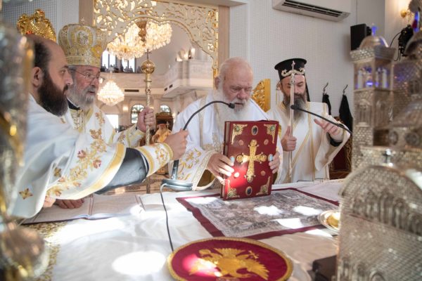 Του πολυαρχιερατικού συλλειτούργου προεξήρχαν οι Μακαριώτατοι Αρχιεπίσκοποι Αθηνών κ.κ. Ιερώνυμος και Κύπρου κ.κ. Χρυσόστομος, συλλειτουργούντων τού Μητροπολ. Βρυούλων κ. Παντελεήμονος ως εκπροσώπου τού Παναγιωτάτου Οικουμενικού Πατριάρχου κ.κ. Βαρθολομαίου, του Μητροπ. Δωδώνης κ. Χρυσοστόμου, των Μητροπολιτών τής Εκκλησίας Κύπρου, Πάφου κ. Γεωργίου, Κιτίου κ. Νεκταρίου, Κυρηνείας κ. Χρυσοστόμου και Τριμυθούντος κ. Βαρνάβα, των Επισκόπων Νεαπόλεως κ. Πορφυρίου και Μεσαορίας κ. Γρηγορίου, και κληρικών τής Εκκλησίας Ελλάδος και Κύπρου. Συμπροσευχόμενοι παρέστησαν επίσης οι Μητροπολίτες Κορωνείας κ. Παντελεήμων και Βόστρων κ. Τιμόθεος καθώς και οι Θεοφιλέστατοι Επίσκοποι Καρπασίας κ. Χριστοφόρος, Αρσινόης κ. Παγκράτιος, Χύτρων κ. Λεόντιος και Νιτρίας κ. Νικόδημος.