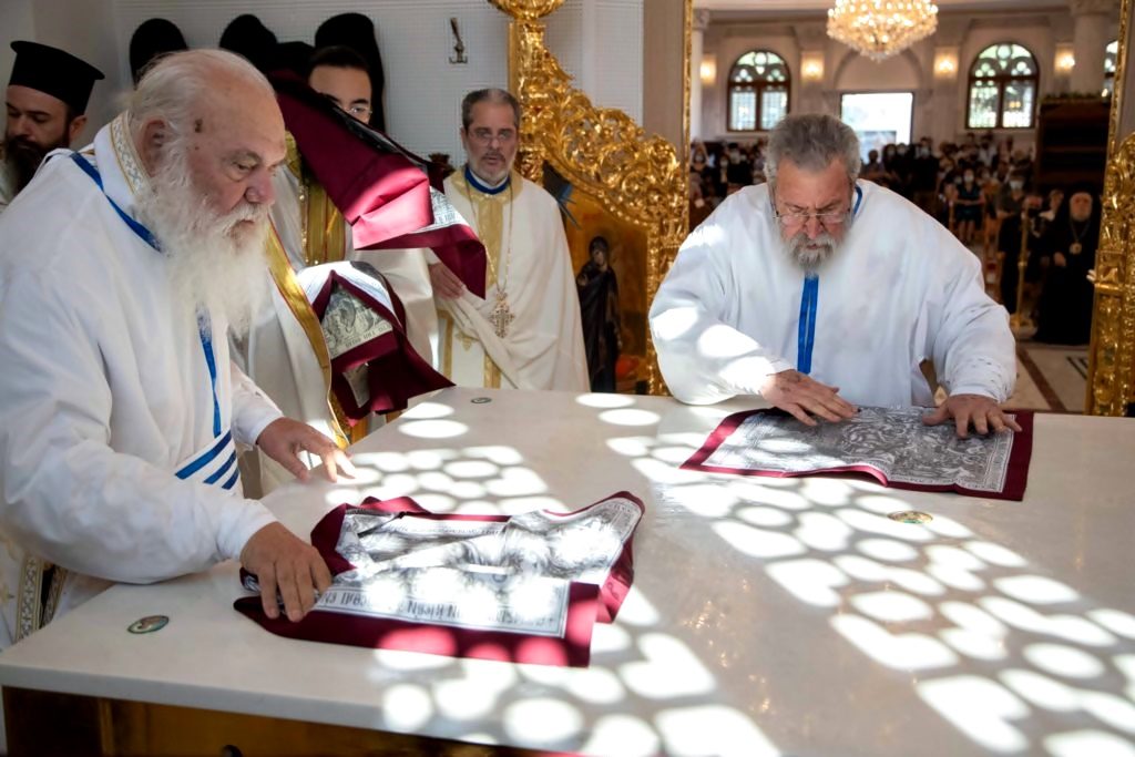 Του πολυαρχιερατικού συλλειτούργου προεξήρχαν οι Μακαριώτατοι Αρχιεπίσκοποι Αθηνών κ.κ. Ιερώνυμος και Κύπρου κ.κ. Χρυσόστομος, συλλειτουργούντων τού Μητροπολ. Βρυούλων κ. Παντελεήμονος ως εκπροσώπου τού Παναγιωτάτου Οικουμενικού Πατριάρχου κ.κ. Βαρθολομαίου, του Μητροπ. Δωδώνης κ. Χρυσοστόμου, των Μητροπολιτών τής Εκκλησίας Κύπρου, Πάφου κ. Γεωργίου, Κιτίου κ. Νεκταρίου, Κυρηνείας κ. Χρυσοστόμου και Τριμυθούντος κ. Βαρνάβα, των Επισκόπων Νεαπόλεως κ. Πορφυρίου και Μεσαορίας κ. Γρηγορίου, και κληρικών τής Εκκλησίας Ελλάδος και Κύπρου. Συμπροσευχόμενοι παρέστησαν επίσης οι Μητροπολίτες Κορωνείας κ. Παντελεήμων και Βόστρων κ. Τιμόθεος καθώς και οι Θεοφιλέστατοι Επίσκοποι Καρπασίας κ. Χριστοφόρος, Αρσινόης κ. Παγκράτιος, Χύτρων κ. Λεόντιος και Νιτρίας κ. Νικόδημος.
