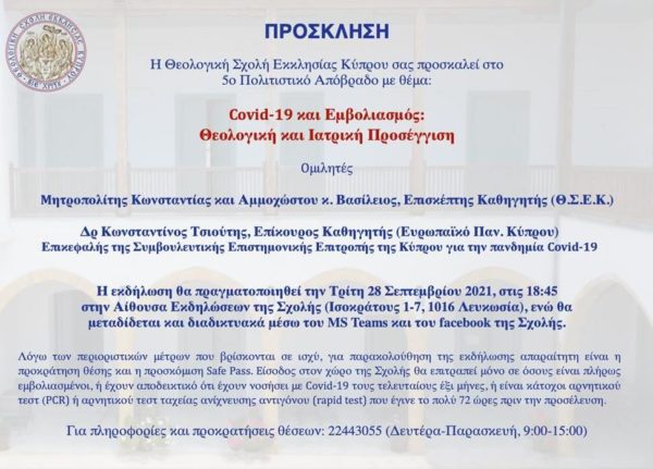Η Θεολογική Σχολή της Εκκλησίας της Κύπρου διοργανώνει διαλέξεις με θέμα “Covid – 19 και Εμβολιασμός: Θεολογική και Ιατρική Προσέγγιση” στα πλαίσια του 5ου Πολιτιστικού Απόβραδου, την Τρίτη 28 Σεπτεμβρίου 2021, στις 18:45 στη αίθουσα εκδηλώσεων της Σχολής.