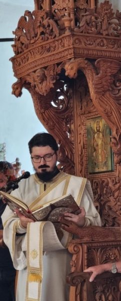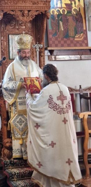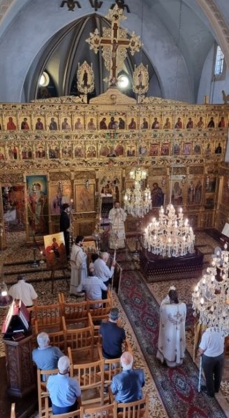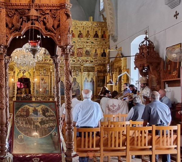 Ο Θεοφιλέστατος Επίσκοπος Μεσαορίας κ. Γρηγόριος, πλαισιούμενος από τον εφημέριο της κοινότητας Οικονόμο π. Νικόλαο Βρακά και το Διάκονο π. Ανδρέα Ματέι, χοροστάτησε στον Όρθρο και προέστη της θείας Λειτουργίας.
