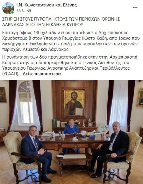 Επιταγή ύψους 130 χιλιάδων ευρώ παρέδωσε ο Αρχιεπίσκοπος Κύπρου κ. Χρυσόστομος στον Υπουργό Γεωργίας της Κυπριακής Κυβέρνησης, κ. Κώστα Καδή, από έρανο που διενήργησε η Εκκλησία για στήριξη των πυρόπληκτων των ορεινών περιοχών Λεμεσού και Λάρνακας.