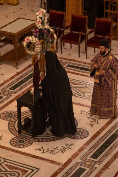 Η προσέλευση τού κόσμου εντός και εκτός τού ναού ήταν αθρόα, όπως είθισται αυτές τις ημέρες.