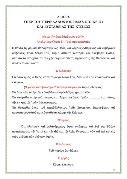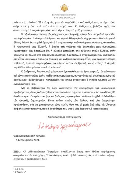 Εγκύκλιο για την ημέρα που γίνεται ειδική μνεία και προσευχή για το «περιβάλλον στοιχείο και την ευστάθεια πάσης της κτίσεως» εξέδωσε η Εκκλησία της Κύπρου. Στην Ελλάδα, η Εκκλησία μας έχει ορίσει αυτό να γίνεται με την Αρχή της Ινδίκτου, την 1η Σεπτεμβρίου. Ωστόσο, στην Κύπρο η Εκκλησία έχει καθιερώσει την πρώτη Κυριακή του Σεπτεμβρίου να αναπέμπονται οι δεήσεις προς τον Θεό τόσο για προστασία όσο και για αποτροπή περιβαλλοντικών καταστροφών, οπότε αυτό το μήνυμα θα αναγνωσθεί την Κυριακή, 5 Σεπτεμβρίου.