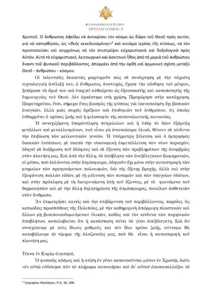 Εξάλλου, όπως αναφέρεται στην εγκύκλιο η θεολογία μας δεν θεωρεί το περιβάλλον ως ξένο σώμα ή αποκομμένο από το ζωντανό σώμα της Εκκλησίας, αλλά σώμα ζώντος Χριστού.