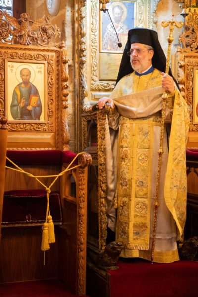 Ο Πανοσιολογιώτατος προεξήρχε τής Θείας Λειτουργίας με συλλειτουργούς κληρικούς τής Ιεράς Αρχιεπισκοπής. Συμπροσευχόμενος παρέστη στο Ιερό Βήμα ο Σεβασμιώτατος Μητροπολίτης Βόστρων κ. Τιμόθεος.