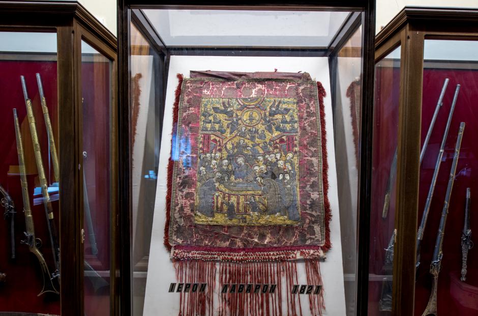 Αυτό είναι το λάβαρο, που το 1821 ο Ηγούμενος της Αγίας Λαύρας θεώρησε πως η εμφάνισή του θα ενθουσίαζε τους επαναστάτες. Το έδωσε λοιπόν στον Μητροπολίτη Παλαιών Πατρών Γερμανό ο οποίος με τη σειρά του πάνω σε αυτό όρκισε τους αγωνιστές του ’21.