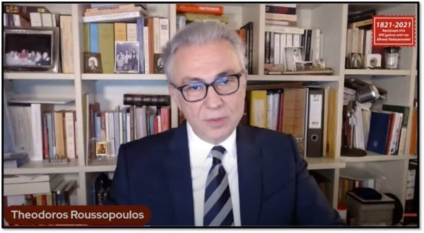 Εν συνεχεία, ο κ. Θοδωρής Ρουσόπουλος, χαιρετίζοντας την εκδήλωση, στάθηκε σε δύο βασικά μηνύματα που πρέπει να κοινωνηθούν σε όλους μας. Καταρχάς, αυτοί που κατέχουν ηγετικές θέσεις και έχουν αναλάβει το εξαιρετικά κρίσιμο καθήκον να διαχειρίζονται πολυεπίπεδα τις υποθέσεις της χώρας, κατ’ αντιστοιχία της συμπεριφοράς που έδειξαν οι ηγέτες της ελληνικής επανάστασης, οφείλουν να δίνουν το παράδειγμα με τη δημόσια στάση τους, εκπληρώνοντας το λειτούργημα τους ως πολιτικοί, ακαδημαϊκοί ή πνευματικοί ταγοί μας. Το δεύτερο μήνυμα αφορούσε τη διαφύλαξη της γλώσσας, του πολιτισμού και της θρησκείας μας καθώς κάθε εθνική ταυτότητα, πόσο μάλλον η δική μας εθνική ιδιοπροσωπεία, συμπυκνούται σε αυτά τα αναλλοίωτα στο χρόνο εθνικά μας χαρακτηριστικά, τα οποία είναι και οι πυξίδες του μέλλοντος μας. Αναφέρθηκε ιδιαίτερα στον πατριάρχη Γρηγόριο Ε’ που με την στάση του αποτελεί ως και σήμερα παράδειγμα ηγέτη και στην εθνική μας ταυτότητα, που ως μετουσίωση της ελληνικής γλώσσας, του ελληνικού πολιτισμού και της Ορθόδοξης Θρησκείας αποτελεί οδηγό στο σύγχρονο γίγνεσθαι.