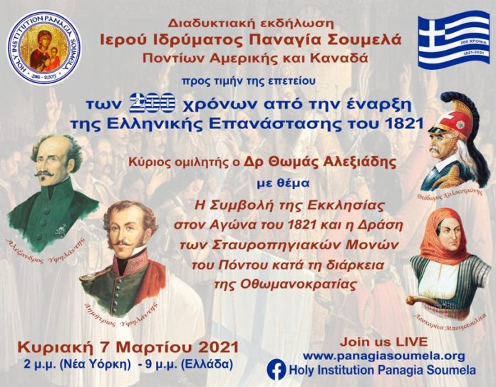 Το Ιερό Ίδρυμα «Παναγία Σουμελά» Ποντίων Αμερικής και Καναδά καλεί την ομογένεια να παρακολουθήσει την πρώτη από μια σειρά εκδηλώσεων για την 200ή επέτειο της Ελληνικής Επαναστάσεως του 1821, η οποία θα λάβει χώρα διαδικτυακά την Κυριακή, 7 Μαρτίου 2021. Κεντρικός ομιλητής της εκδήλωσης είναι ο Δρ. Θωμάς Αλεξιάδης, ο οποίος θα αναφερθεί στην «Συμβολή της Εκκλησίας στον Αγώνα του 1821 και στην Δράση των Σταυροπηγιακών Μονών του Πόντου κατά τη διάρκεια της Οθωμανοκρατίας».