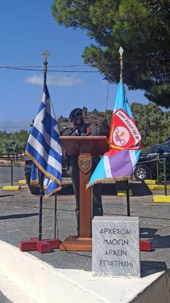 Στο σύντομο χαιρετισμό του, ο Διοικητής της Σχολής, Ταξίαρχος Βασίλειος Βασιλειάδης, ανέφερε μεταξύ άλλων, ότι “η θυσία του σεμνού αγωνιστή αποτελεί παρακαταθήκη, έμπνευση και φόρο τιμής για τους μαθητές της Σχολής”.