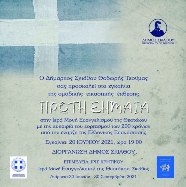 Έχοντας υπ’ όψιν αυτό το γεγονός και με αφορμή τα 200 χρόνια από την έναρξη της Ελληνικής Επανάστασης, φέτος -και συγκεκριμένα από τις 20 Ιουνίου και μετά- στην Ιερά Μονή Ευαγγελισμού της Θεοτόκου στη Σκιάθο θα φιλοξενηθεί μια ομαδική εικαστική έκθεση, με αντικείμενο την ελληνική σημαίαΗ έκθεση πραγματοποιείται με την επιμέλεια της Ίριδας Κρητικού και εγκαινιάζεται την Κυριακή 20 Ιουνίου.